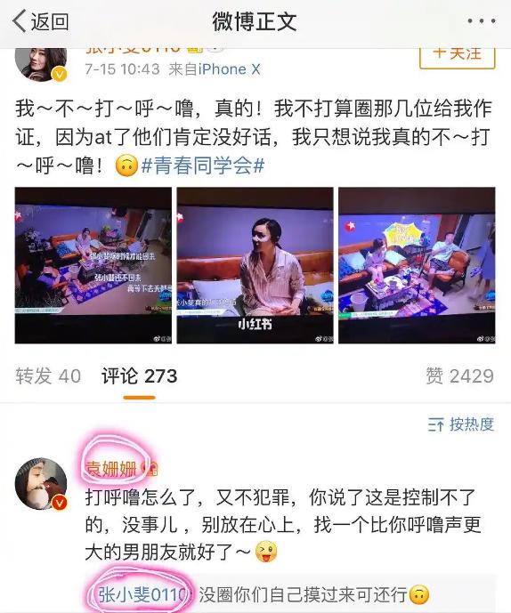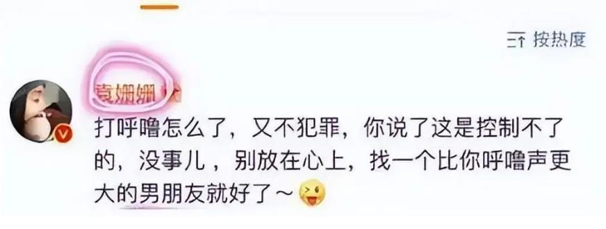 事后,张小斐越想越委屈,甚至发了微博澄清自己不打呼噜,没想到袁姗姗又现身张小斐的评论区,回复道“打呼噜怎么了,又不犯罪,你说了,这是控制不了的,没事儿,别放在心上,找一个比你呼噜声大的男朋友就好了 。”