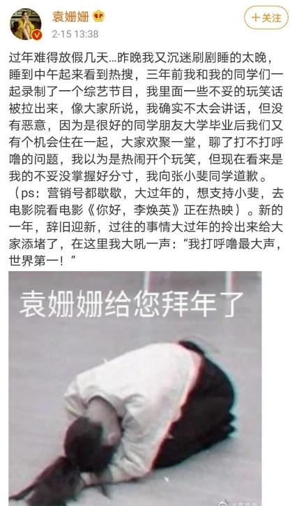 发文就打呼噜一事向张小斐道歉,称自己当时没掌握好分寸,可这份迟到三年的道歉,在很多人看来,似乎更像是一种蹭热度的行为 。