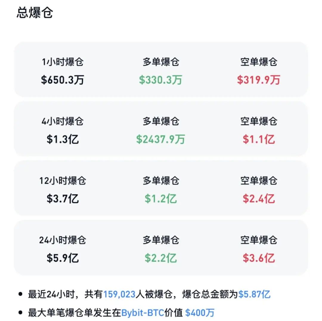 Coinglass数据显示,过去24小时加密货币市场共有近16万人被爆仓,爆仓总金额为5.87亿美元,其中多单爆仓2.2亿美元,空单爆仓3.6亿美元。